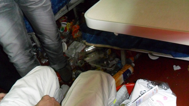もうみんななんで平気で床にゴミ捨てれるんだろう?w袋一枚用意してそんなかに捨てれば済む話じゃんwだいたいこうなるのわかってんのにゴミ箱ひとつ用意しない鉄道会社もどうなってんだよw(いや、あるにはあるんだが車両の継ぎ目にあるんで、実質この混み具合ではそこまで移動できない)